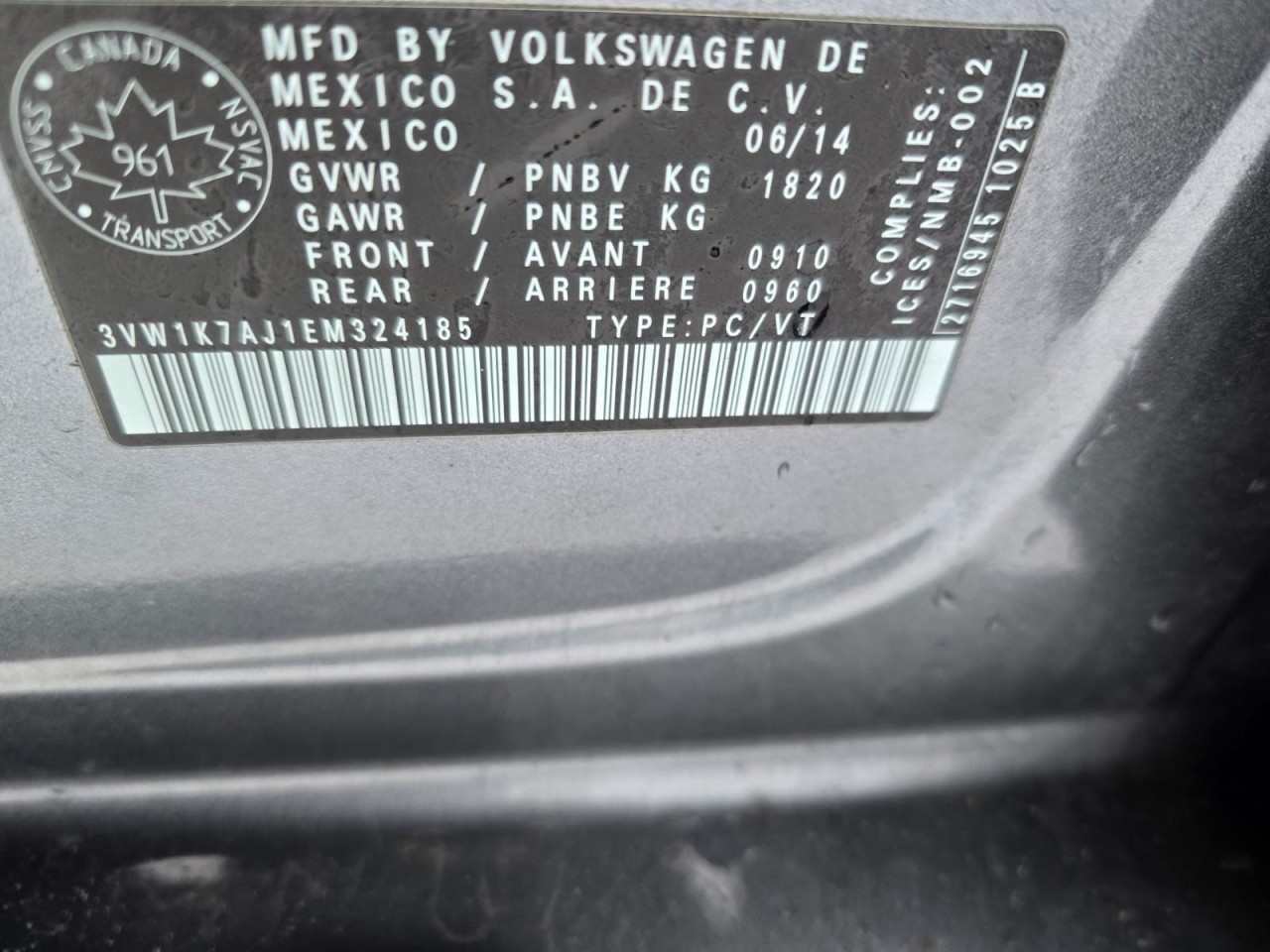 VIN #: 3VW1K7AJ1EM324185